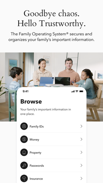 موثوق - تطبيق Family OS هو تطبيق مجاني لنظام iPhone تم تطويره بواسطة شركة موثوقة للحفاظ على تنظيم وحماية وتحسين معلومات العائلة الهامة الخاصة بك. يوفر عرضًا واحدًا لمعلومات العائلة الهامة بما في ذلك هويات العائلة والمال والعقارات وكلمات المرور والتأمين والضرائب ووثائق الممتلكات ووثائق الطوارئ. مع تطبيق موثوق، يمكنك أن تقول وداعًا للفوضى ومرحبًا بمعرفة مكان كل شيء بالضبط.